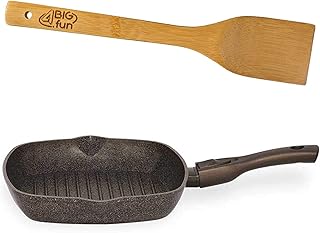 Poêle grill de 28 cm avec triple revêtement antiadhésif + poignée amovible + spatule en bambou | Poêle à steak carrée | Marron, aspect granit | Aluminium * 22 cm fond