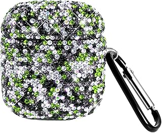 Coque AirPods 1,Coque AirPods 2,avec mousqueton Bling brillant Diamant Filles Femmes Crystal Dur PC étanche poussière Protection Skin Slim Case Housse Etui Coque pour AirPods 1&2,Noir + Vert